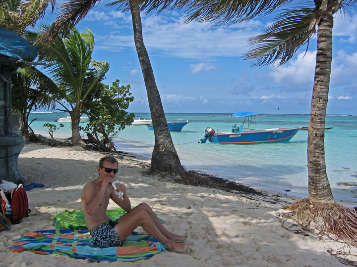 La sua piccola imbarcazione (solamente 12 persone) parte dal porticciolo di Sainte-Rose per gite di mezza o un’intera giornata, noi abbiamo fatto la mezza giornata, pranzo escluso a 35 euro a testa (un po’ caruccio..). All’andata si fa una sosta per lo snorkeling sulla barriera corallina e poi si giunge all’Ilet Caret per la sosta pranzo; appena avvistata l’isoletta si comprende di non essere i soli fortunati ad avere il privilegio di sbarcare qui..ci sono moltissime imbarcazioni attraccate e decine di persone in fila per i barbecue delle varie gite organizzate… Comunque il nostro angolino di paradiso riusciamo a trovarlo lo stesso, ci gustiamo il nostro panino sotto ad una palma e la vista è completamente libera davanti a noi, solo il mare cristallino in cui ci godiamo un bagno lungo praticamente tutto il tempo che siamo rimasti…